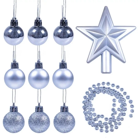 Do kompletu dołączamy także trzy różne rodzaje bombek: brokatowe, matowe i błyszczące. Każda z nich będzie wyglądała efektownie na gałęziach choinki, nadając jej bajecznego uroku. Całość prezentowanego zestawu utrzymana jest w eleganckim, srebrnym kolorze.