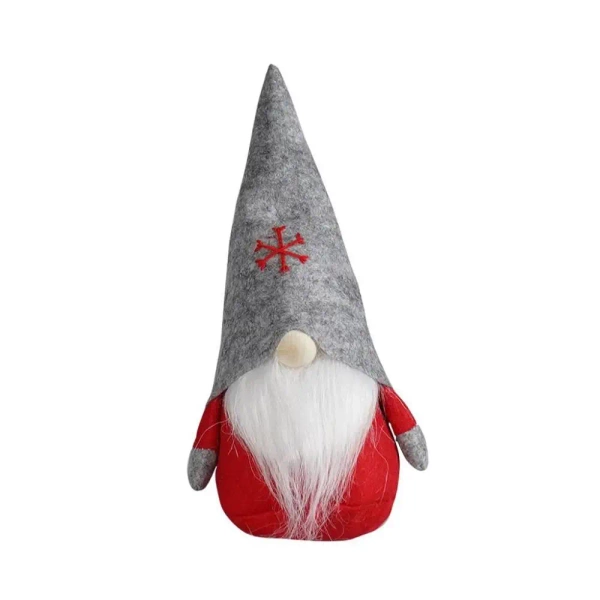 Piękna dekoracyjna figura skrzata w czerwonym ubraniu z dużą szarą czapką i puszystą białą brodą, która dodaje mu uroku. Czapka filcowa, przyozdobiona jest na wierzchu czerwonym haftem w kształcie płatka śniegu, nadając ozdobie świąteczny charakter. Twórcy skrzata zdecydowali się na wykorzystanie drewna, z którego wykonana jest jego buzia. Konstrukcja produktu jest taka, że ozdoba ma możliwość samodzielnego stania, co ułatwia jej ustawienie i ekspozycję. Dbając o stabilność skrzata, producent obciążył dolną część produktu, zapewniając jego niewzruszalność. Wysokość figurki wynosi 25 cm.