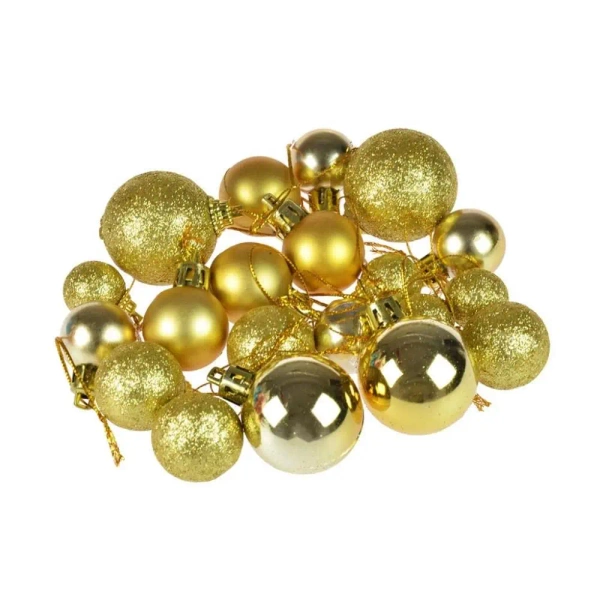 Prezentowany zestaw to zróżnicowany komplet ozdobnych akcentów choinkowych o średnicy od 2 do 4 cm, które błyszczą pięknym, złotym blaskiem.