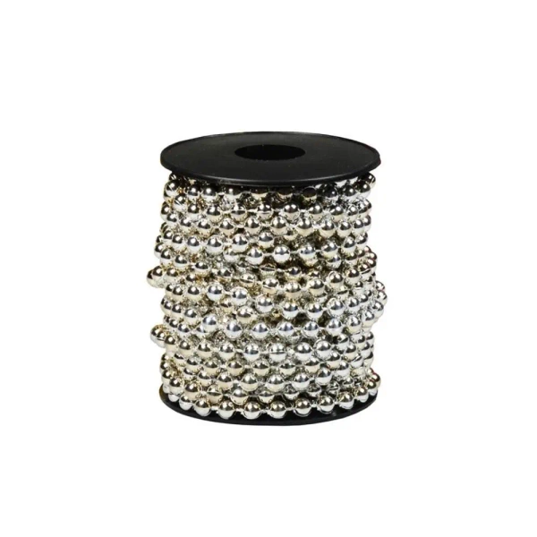 Ta propozycja to srebrny łańcuch z koralików, o średnicy koralika 6 mm, dostępny na wygodnej w użyciu szpuli. Ten uniwersalny produkt to święcąca dekoracja, idealna zarówno do ozdabiania choinki, jak i innych przedmiotów. Jako że ten łańcuch świetnie komponuje się z różnorodnymi stylistykami, można go użyć w dowolnym miejscu w domu, np. przy ozdabianiu stroików. Długość łańcucha wynosi 6 metrów.