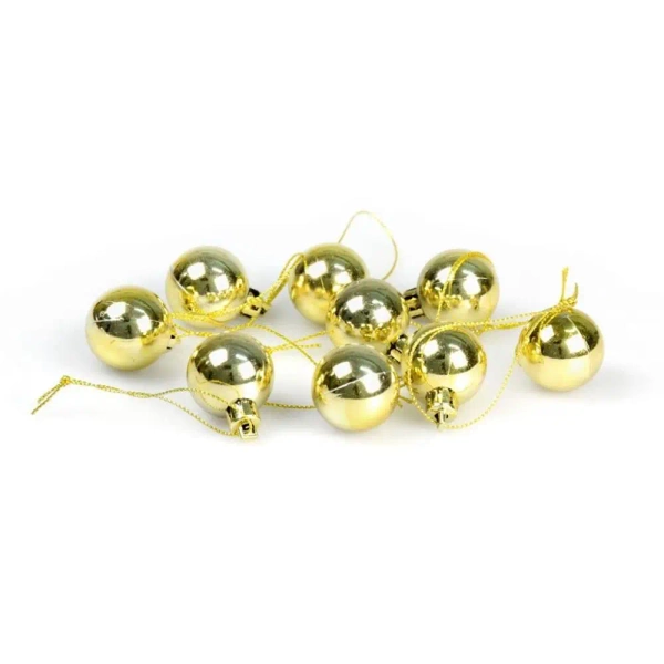 Prezentowany komplet składa się z 9 sztuk maleńkich bombek w kolorze złotym. Każda z nich ma średnicę 3 cm, co czyni je subtelnymi i urokliwymi elementami dekoracyjnymi.