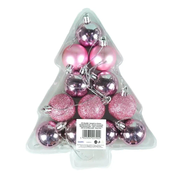 Przystrojone pudełko ukierunkowane swoim wyglądem na świąteczny klimat, przypomina kształtem tradycyjną choinkę. Gdy spojrzysz przez przeźroczyste ścianki opakowania, łatwo jest zaznajomić się z zawartością, nawet nie wyjmując bombek. Komplet składa się z trzech różnych rodzajów ozdób - są to bombki o błyszczącej, matowej i brokatowej powierzchni. W jednym zestawie znajduje się 12 sztuk tych pięknych dekoracji o średnicy 4 cm.