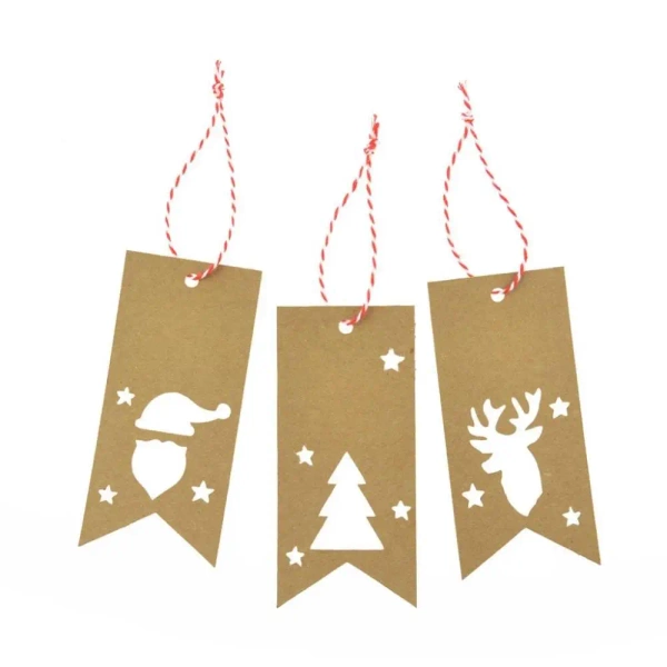 Przedstawiamy komplet 12 ekologicznych zawieszek na prezenty. Każda z nich ma wymiary 5x10 cm.