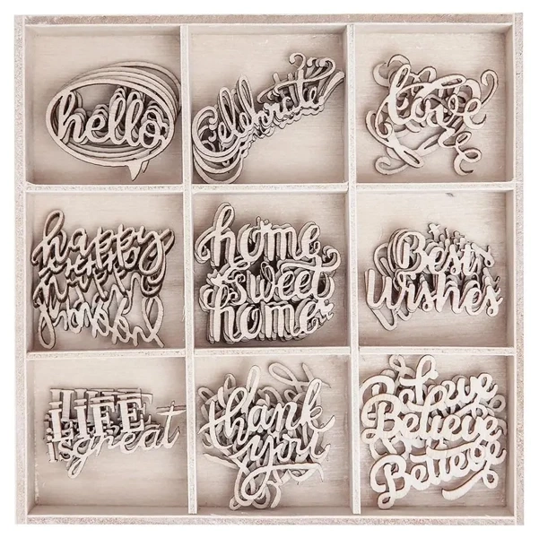Wyróżnij swoje projekty za pomocą chipboardów z napisami prezentowanymi w unikalnych fontach. W komplecie otrzymasz drewniane elementy z budującymi hasłami, takimi jak: "love", "happy", "Life is great", "Best wishes" oraz "Thank you".