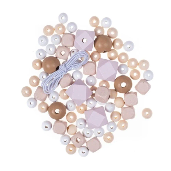 Zestaw obejmuje: naturalne drewniane kulki o średnicy 10 mm - 30 sztuk, białe kulki o średnicy 10 mm - 30 sztuk, kremowe kształty sześcienne o średnicy 12 mm - 12 sztuk, kulki w odcieniu ciemnego beżu o średnicy 15 mm - 4 sztuki, różowe wielościany o średnicy 18 mm - 4 sztuki i biały elastyczny sznurek o długości 1 metr.