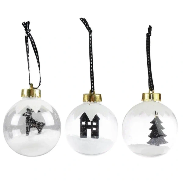 Prezentujemy bombkę ozdobną, która charakteryzuje się przezroczystością. Jej wyjątkowy wygląd dodatkowo podkreślany jest przez czarne elementy, które przyciągają wzrok. Całość dopełniona jest niezwykle realistyczną imitacją śniegu. Zwracamy uwagę, że średnica bombki wynosi 8 cm, co dodaje jej uniwersalności, w związku z możliwością dopasowania do różnej wielkości choinki.