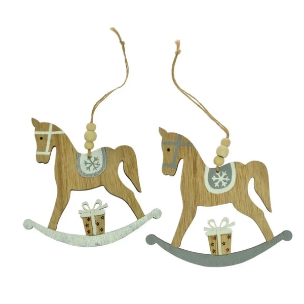 Ta stylowa zawieszka wykonana z drewna prezentuje się jako mały koń na biegunach. Zawieszka przykuje uwagę swoją subtelną kolorystyką, gdzie dominują biel i szarość. Zawiera malowane detale takie jak: bieguny, siodło i prezent. Zawieszka posiada praktyczny, naturalny sznurek z koralikiem, co umożliwia łatwe zawieszenie. Całość ma wymiary 11 cm.