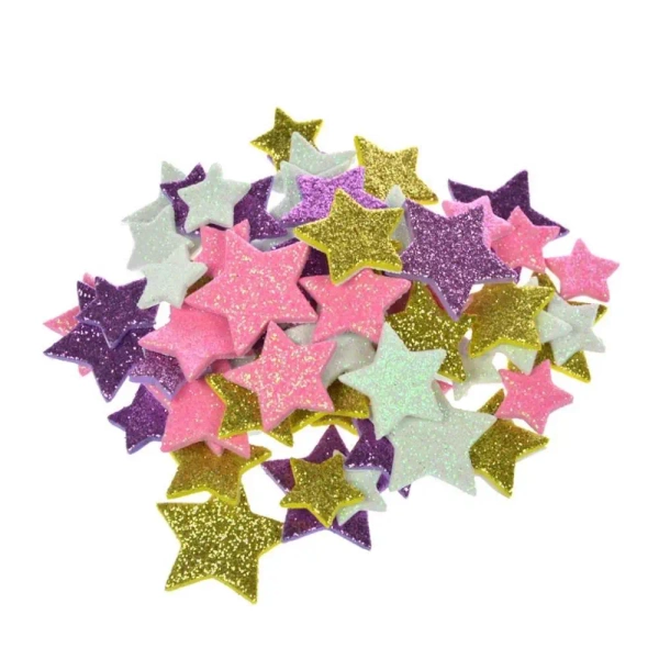 Produkt składa się z naklejek, które powstały z brokatowej pianki. Dzięki temu materiałowi każda z gwiazdek wspaniale błyszczy i mieni się w świetle. Te gwiazdkowe naklejki to doskonała ozdoba - mogą ozdobić prezenty, kartki świąteczne czy różnego rodzaju kompozycje zimowe, takiego jak na przykład choinka czy stroik bożonarodzeniowy. W zestawie znajduje się mieszanka gwiazdek w zróżnicowanych rozmiarach, od 2 do 3 cm. W opakowaniu, które otrzymasz, znajduje się do koła 66 naklejek.