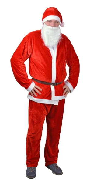 Garnitur św. Mikołaja dla dorosłych, dostępny w uniwersalnym rozmiarze. Zestaw obejmuje: sweter, szorty, brodę, kapelusz i pasek.