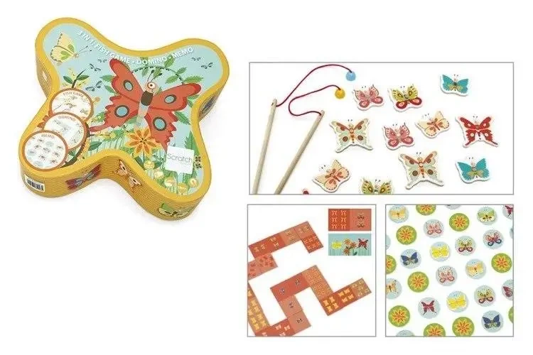 Scratch wprowadza innowację do gier planszowych poprzez połączenie trzech różnych rozgrywek w jednym. Dzieci mogą na przemian łapać motylki, grać w memo, a także bawić się w domino, wszystko to za pomocą tej samej, drewnianej gry.