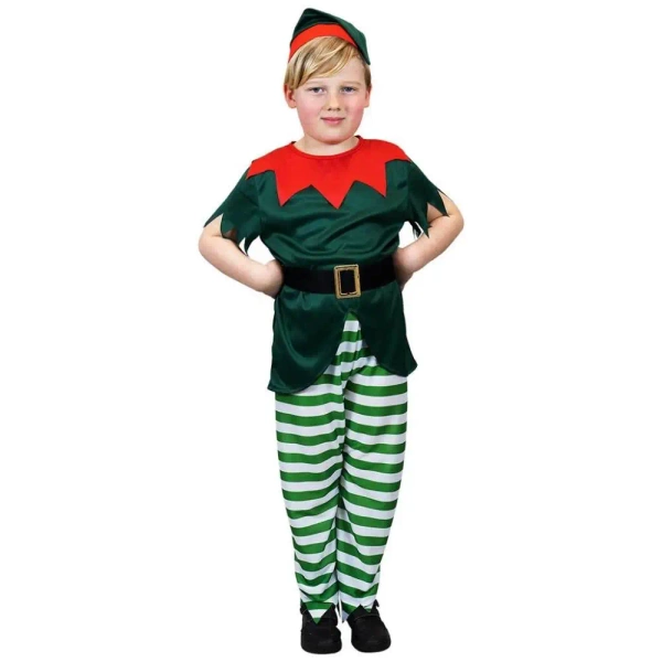 Oferujemy kostium elfa specjalnie przygotowany dla małych użytkowników. W pakiecie znajdziesz: kapelusz, bluzkę ze specjalnym kołnierzykiem, spodnie oraz pasek. Zarówno kapelusz, jak i bluzka utrzymane są w kolorze zielonym, a dodatek czerwonego pasa u dołu kapelusza i czerwonego kołnierzyka na bluzce dodają uroku i wyrazistości. Kapelusz posiada wszyty elastyczny pasek, dzięki czemu łatwo go dopasować do każdej główki.