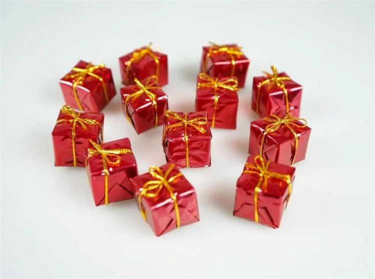 Pakiet zawiera 12 elementów dekoracyjnych przypominających niewielkie upominki. Te czerwone mini-prezenciki są idealne do udekorowania świątecznej choinki lub różnych kompozycji i stroików. Rozmiar każdej z ozdób to 2,5x2,5 cm.