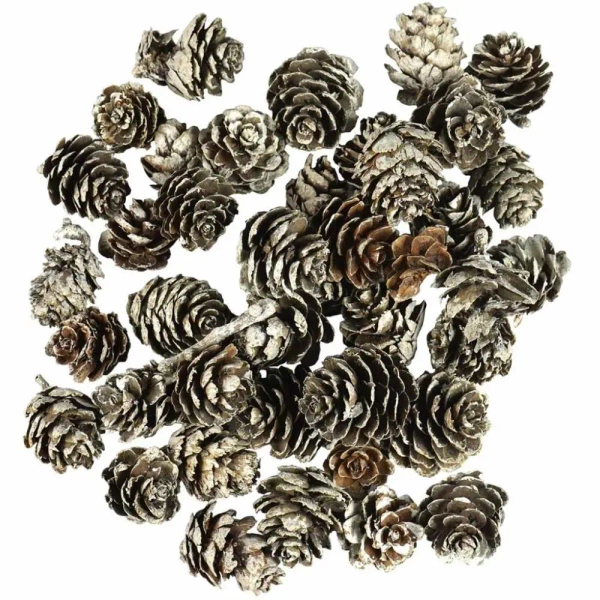 Ręcznie barwione szyszki z modrzewia, które prezentują się jakby były pokryte śniegiem. Doskonały dodatek do wykonania stroików, wieńców oraz ozdób na jesienne czy świąteczne okazje. Szyszki mają średnicę około 2 cm. W jednym opakowaniu można znaleźć 65g tego niepowtarzalnego produktu.
