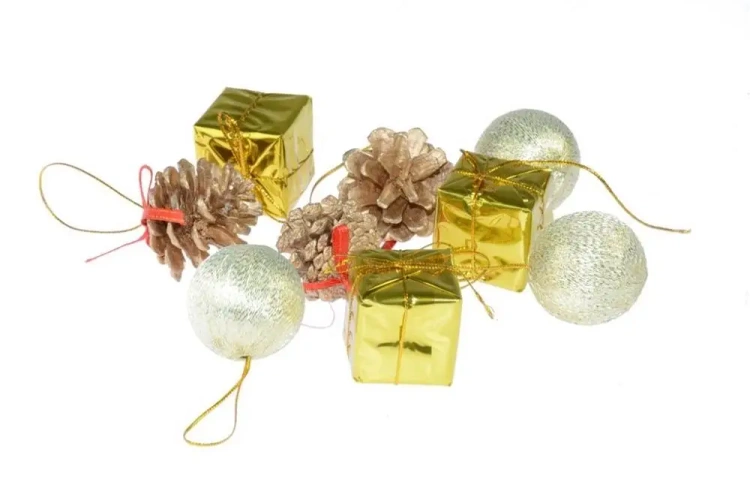 W skład tego zestawu wchodzą różne typy ozdób świątecznych. Znajdują się tu kuliste zawieszki, niewielkie, złote paczuszki, a także naturalne szyszki z dekoracyjną wstążką. Mają one przewidywane zastosowania zarówno jako urozmaicenie tradycyjnej choinki, jak i elementy świątecznych stroików czy kompozycji. Wszystkie ozdoby są zbliżone wielkością - ich rozmiary wynoszą blisko 3,5 cm.