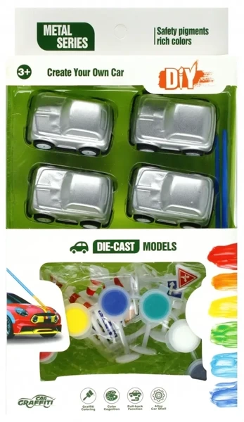 Package zawiera: 4x samochód, 2 x pędzel, 6x farby akrylowe w różnych kolorach, zestaw akcesoriów drogowych, takich jak znaki drogowe, pachołki.