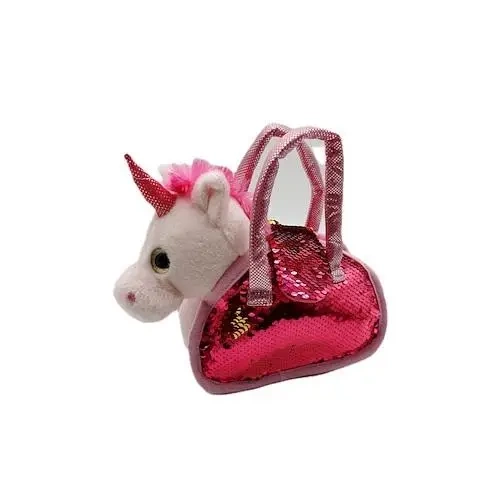Maskotka w kształcie jednorożca to gwarancja uśmiechu na twarzy każdego malucha. Ten uroczy pluszak jest umieszczony w torbie wysypanej cekinami, w kolorze różowym i docenianym przez małe damy.