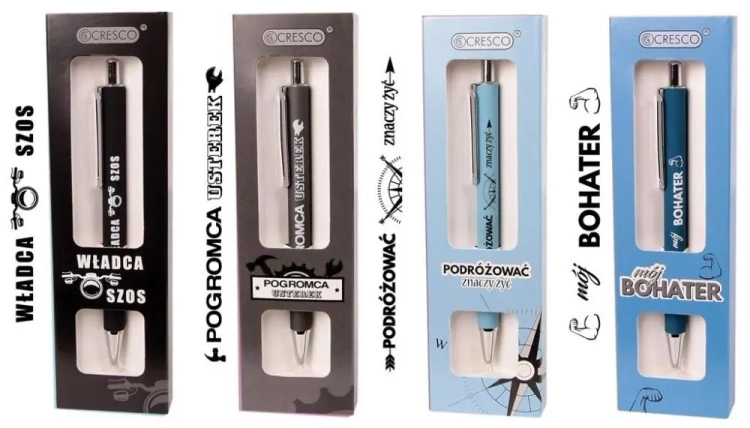 Ciekawa kolorystyka z męskim charakterem i srebrnymi akcentami. Na powierzchni długopisu umieszczono 4 różne sentencje: "Władca szos", "Pogromca usterek", "Podróżować znaczy żyć", "Mój bohater". Dokładność wzoru została podkreślona dodatkowym motywem graficznym. Każdy z długopisów opakowany jest w eleganckie etui GB, które doskonale sprawdzi się jako prezent dla mężczyzny.
