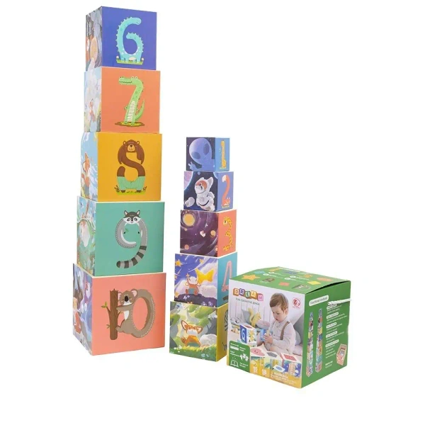 Wieża do układania od Askato składa się z dziesięciu kwadratowych bloków kartonowych, które dzieci muszą ułożyć w porządku od największego do najmniejszego. Jest to zabawka, która wymaga od dzieci umiejętności dopasowania boków do odpowiednich wzorów, co w praktyczny sposób rozwija umiejętności rozpoznawania kształtów i wzorów.