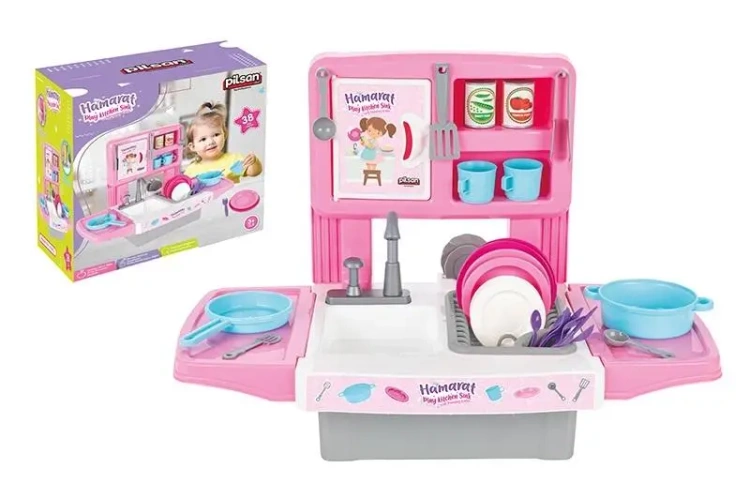 Prezentujemy Wam zestaw, który zawiera zlewozmywak z działającym kranem, suszarkę do naczyń, garnek, patelnię, a także sztućce, talerze i kubki. Wymiary całego zestawu wynoszą 71 x 37 x 49 cm. Rekomendowany dla dzieci w wieku 3 lat i więcej.