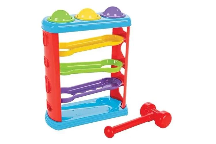 Zawartość zestawu to: kolorowa zjeżdżalnia zaprojektowana specjalnie dla piłeczek, trzy różnokolorowe piłeczki oraz młoteczek. Zjeżdżalnia ma wymiary: 24 x 31 x 10 cm, natomiast wymiary opakowania to: 24,5 x 29 x 10,5 cm. Produkt przeznaczony jest dla dzieci w wieku 12 miesięcy i więcej.