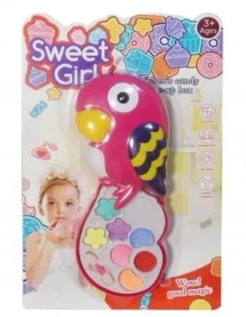 Zestaw dla małych damskich fryzur, które czerpią radość z zabawy z makijażem. W skład kompletu wchodzą kolorowe cienie do powiek - 7 sztuk, dostarczone razem z aplikatorem. Prezentowany produkt zapakowany jest w pudełko, które przypomina papugę, dodając jeszcze więcej uroku i koloru.Produkt umieszczony jest na kartonowym stojaku, zabezpieczonym przezroczystą osłoną.
