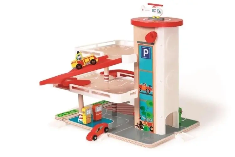 Drewniany garaż składa się z kilku poziomów, wraz z miejscami do tankowania i parkowania, a nawet z lądowiskiem dla helikoptera. W najbardziej kompletnej formie zestaw zawiera też dodatkowe 5 plastikowych ramp, 2 drewniane autka, drewniany helikopter oraz 3 zdejmowane drewniane pompy paliwowe.