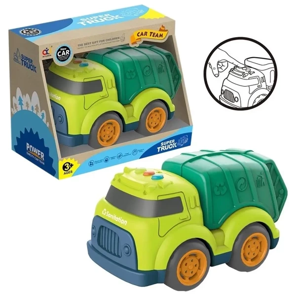 Prezentujemy Ci śmieciarkę Askato, która z pewnością przyciągnie uwagę Twojego dziecka dzięki wbudowanemu światłu i dźwiękom. Produkt zasilany jest za pomocą trzech baterii typu AG13, które dołączamy do zestawu.