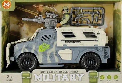 Kluczowym elementem zestawu jest samochód wojskowy z ruchomymi elementami, co przyciąga uwagę każdego dziecka. Na aucie umieszczony jest karabin, który zapewnia efekty dźwiękowe i świetlne. Do jego działania potrzeba 3 baterie AG13, które są dołączone do zestawu.Figurka żołnierza i akcesoria wojskowe
