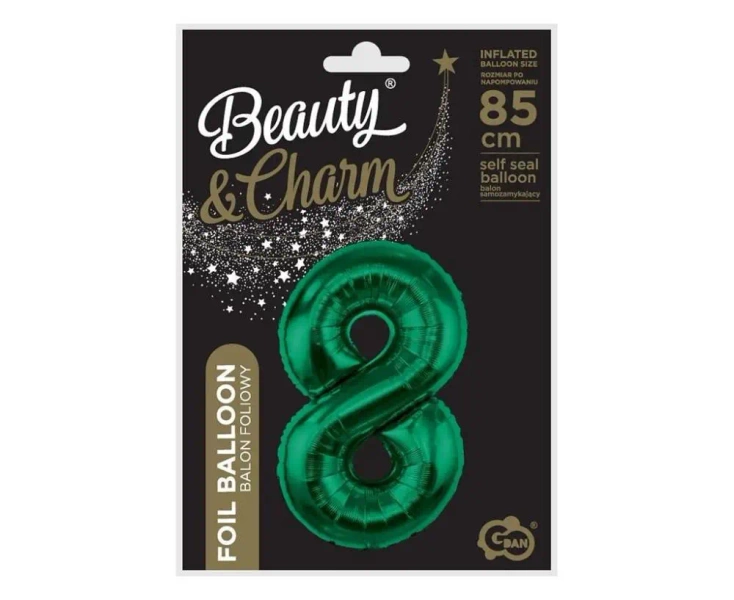 Unikalny balon foliowy, zaprojektowany przez GoDan, doskonale sprawdzi się jako atrakcyjny element dekoracji na różnego rodzaju imprezach. - Wymiary balonu po napompowaniu: 85 cm - Forma: Cyfra 8 - Barwa: Odcień butelkowej zieleni - Wzór: Nie posiada - Ilość w zestawie: 1 sztuka - Seria: Beauty&Charm Balony z tej kolekcji są przeznaczone do napełnienia helem, co pozwoli im swobodnie unosić się w powietrzu. Wypełnienie ich powietrzem nie zagwarantuje takiego efektu. Balony nie są wstępnie napełnione ani helem, ani powietrzem. Każdy balon jest wyposażony w zawór samozamykający, dzięki czemu proces napełniania jest łatwy i szybki.EAN: 5902973190298