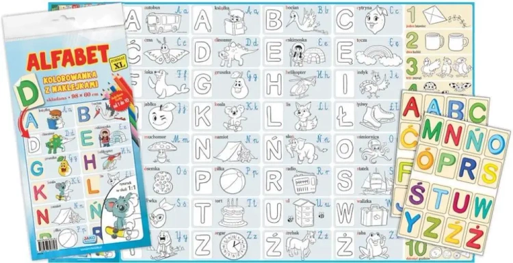 Kolorowanka "Alfabet" to składany zestaw edukacyjny, który ułatwia dzieciom naukę znaków polskiego alfabetu oraz właściwego porządku liter. Pomoże poznać kolejność alfabetu oraz literki zarówno drukowane jak i pisane. W skład kompletu wchodzi ogromny arkusz XL oraz 32 naklejki z wydrukowanymi, dużymi literami.