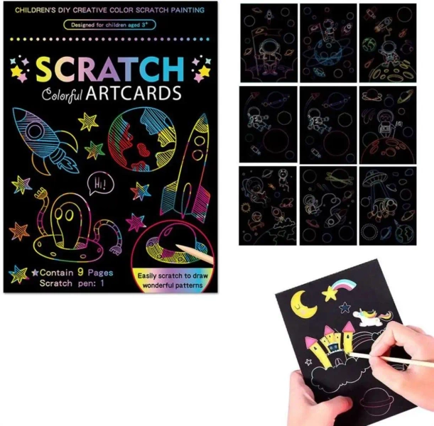 Zdrapywanki - czarne karty z farbą do zdrapywaniaW zestawie dostaniesz 9 kart - każda z nich pokryta jest specjalnym, zdrapywalnym pokryciem. Nanieś na nie swoje rysunki za pomocą załączonego patyczka, odkrywając ukryte pod pokryciem kolory. Dzięki temu powstanie oryginalny obrazek pełen kosmicznych kształtów i barw.