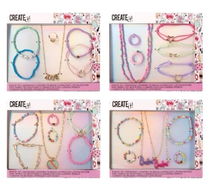 Odkryj różnorodność zestawu biżuterii, obejmującego cztery typy kompletów. W skład zestawu wchodzą bransoletki, kolczyki oraz naszyjniki.