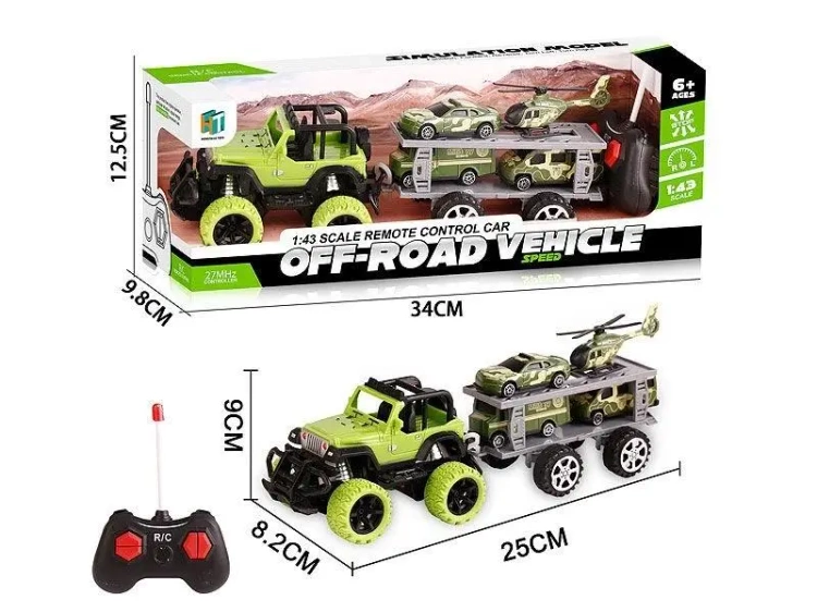 Wojskowe samochodziki na radiową kontrolę z obszerną przyczepą.