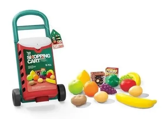 Zabawka posiada w zestawie plastikowe owoce i warzywa, takie jak 2 banany, winogrona, pomarańcza, pigwa, pomidor, ziemniak, papryka oraz 2 jajka. Dodatkowo, do wózka dołączona jest imitacja produktów spożywczych w kartonikach. Działają one jako świetne rekwizyty podczas zabawy.