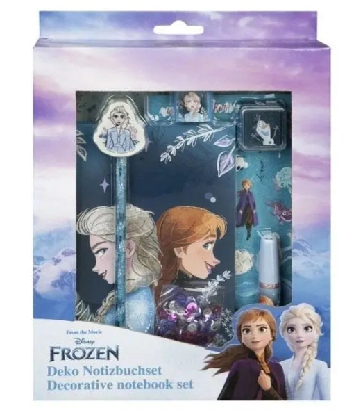 Zestaw dla maluchów, inspirowany filmem Kraina Lodu, obejmujący kreatywny notatnik. Notatnik wymiarami 11,80 x 17,70 cm posiada 60 stron z nadrukiem jednokolorowym. Ponadto, w skład zestawu wchodzą cekiny w dwóch różnych kolorach, brokatowy klej oraz praktyczna pieczątka oraz blok do stempli. Dodatkowo, do dyspozycji mamy ołówek wyposażony w gumkę oraz arkusz naklejek o wymiarach 10,50 x 15,50 cm.