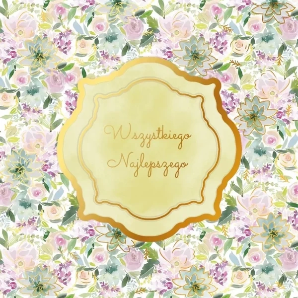 Karnet KW "Wszystkiego najlepszego" prezentuje się w formacie o wymiarach 15 x 15 cm. Posiada wysokiej jakości wydruk, gwarantujący trwałość i estetykę. Cała powierzchnia karnetu zdobiona jest za pomocą metody tłoczenia, dając unikalne i wyróżniające się wzory. Ponadto, dla dodatkowego efektu elegancji, zastosowano eleganckie złocenia. Do karnetu dołączona jest kolorowa koperta, idealnie dopasowana stylem oraz kolorystyką.