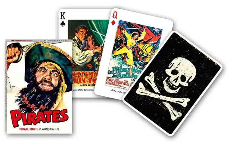 Prezentujemy unikalne karty do gry, które wyróżniają się niebanalnymi wzorami. Na awersach kart znajdują się reprodukcje plakatów z klasycznych filmów o piratach, co czyni je oryginalnym elementem dla fanów pirackiego kina. Z kolei, na rewersach kart umieszczone są motywy nawiązujące do popularnej tematyki pirackiej.
