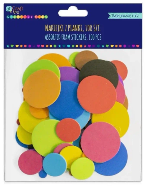 W ofercie mamy dla Ciebie setkę kolorowych naklejek z pianki, które przybierają formę okręgów. Znajdziesz tu naklejki o różnych średnicach i barwach.