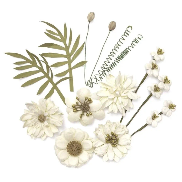 Kwiaty w różnych kształtach i rozmiarach zostały ręcznie uformowane z papieru w kremowym kolorze. Mniejsze kwiatki dodatkowo posiadają łodyżki z drucika co nadaje im plastyczności i ułatwia łączenie z innymi dodatkami._x000D_