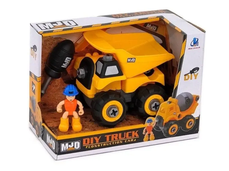 Zabawkowy samochód budowy - wywrotka, przeznaczony do montażu, z miniaturką pracownika budowy i śrubokrętem w zestawie.