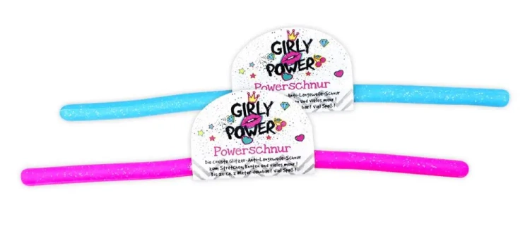 Poznaj wyjątkowy, brokatowy sznurek antystresowy Powerstring, idealny do rozciągania i wiązania! Możesz go rozciągnąć nawet do 2 metrów, a jego długość wynosi 30 cm.