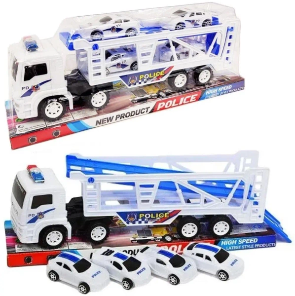 Zestaw zabawkowy składający się z lawety policyjnej o otwieranej tylnej części oraz kompletu czterech autek.