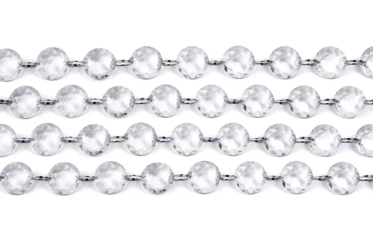 Ta bezbarwna girlanda kryształowa to elegancki dodatek do dekoracji wnętrza. O długości całkowitej 1 metr, stanowi pociągającą ozdobę dla każdego pomieszczenia. Każde z kryształowych kółek w tej girlandzie ma średnicę 18 milimetrów, co dodatkowo potęguje jej efektowny wygląd.