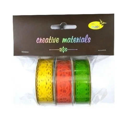 Zestaw 3 szt. taśm samoprzylepnych ażurowych szerokości 18 mm , długości 0.9 mb każda. Taśm można używać jako zdobień do tworzenia kartek, scrapbookingu oraz do innych zdobień w pracach plastycznych.