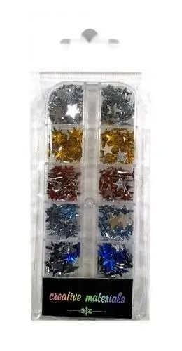Te gwiazdkowe "klejnoty" z płaską podstawą są wytwarzane z przejrzystego, sztucznego materiału. Charakteryzują się srebrnym, metalizowanym dnem. Są one sprzedawane w zgrabnym opakowaniu z zawieszką typu euro, które zawiera różnorodne elementy o średnicy 8 mm. Zestaw składa się z gwiazdek w 12 unikalnych kolorach, a wszystko to starannie ułożone w praktycznym pojemniku z 12 osobnymi przegródkami.