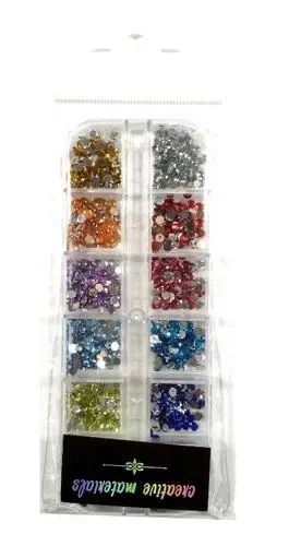 Prezentowany tu produkt to okrągłe kryształki z płaskim dnem, stworzone z transparentnego materiału syntetycznego. Dno kryształków jest srebrne i metalizowane. W zestawie, który zapakowany jest w opakowanie z eurozawieszką, znajdują się kryształki o średnicy 4 mm w różnej kolorystyce - dokładnie w 12 odcieniach. Kryształki są umieszczone w plastikowym pudełku z 12 przegródkami dla wygody przechowywania i użytkowania.