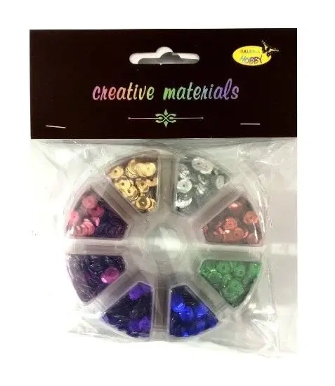 Pudełko, w którym są przechowywane cekiny, ma 8 przegródek. Posiada cekiny w 8 różnych kolorach o średnicy 6mm, o łącznej wadze 40g.