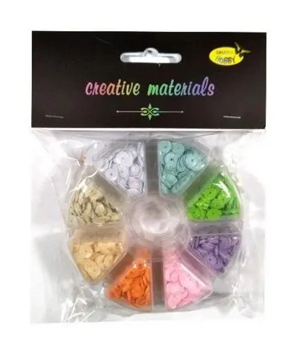 Przedstawiamy Państwu zestaw pastelowych cekinów, które są kawałeczkami foil alu o wielkości 6mm. Komplet ten zawiera aż 40 gram kolorowych elementów.