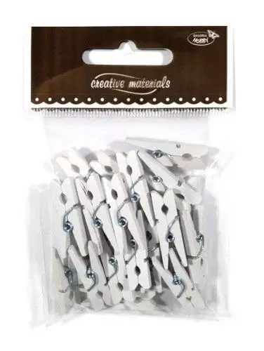 Prezentujemy Państwu kompaktowe, białe klamerki drewniane, o długości 30 mm, uzupełniające naszą ofertę. Przygotowane są w praktycznej paczce, posiadającej otwór umożliwiający łatwe zawieszenie na haku.