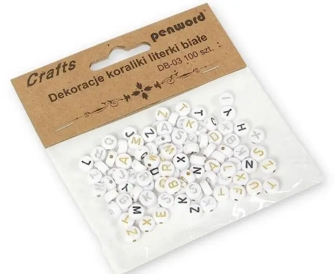 Przedstawiamy zestaw 100 sztuk białych koralików, które mają kształt liter. Każda z nich ma wielkość 7x7mm.